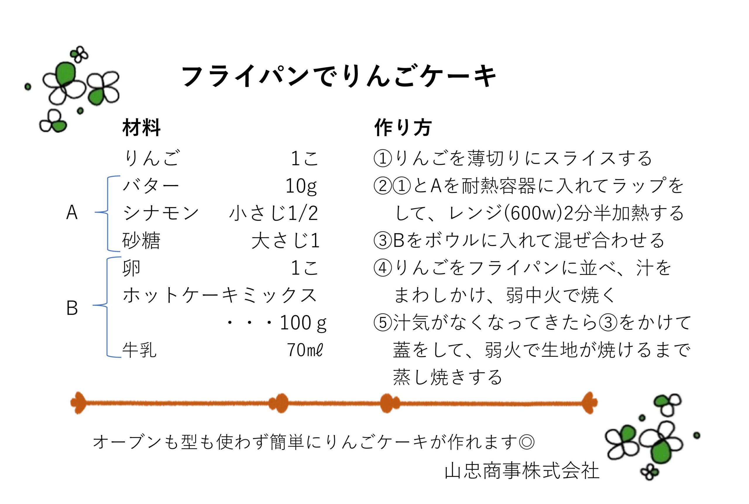 口福レシピ12月号~フライパンでりんごケーキ~ 12月初旬の寒波で、丹波の山々はうっすらと雪化粧をまといました。ちょうど紅葉を楽しめる時期だったこともあり、市内の紅葉スポットでは「雪もみじ」という赤く色づいた紅葉の木々に雪が舞い降りるという珍しくも美しい景色が楽しめたようです。 さて12月の口福レシピは「フライパンでりんごケーキ」です。旬のりんごを使ったスイーツです。オーブンも型も使わず簡単にできるので是非お試しください。